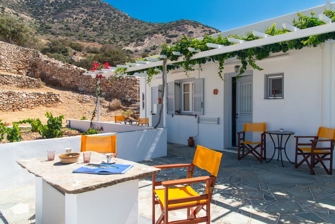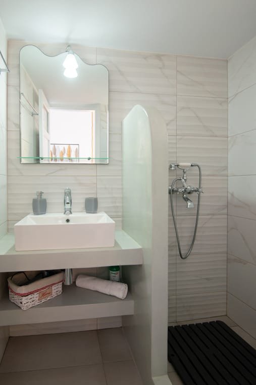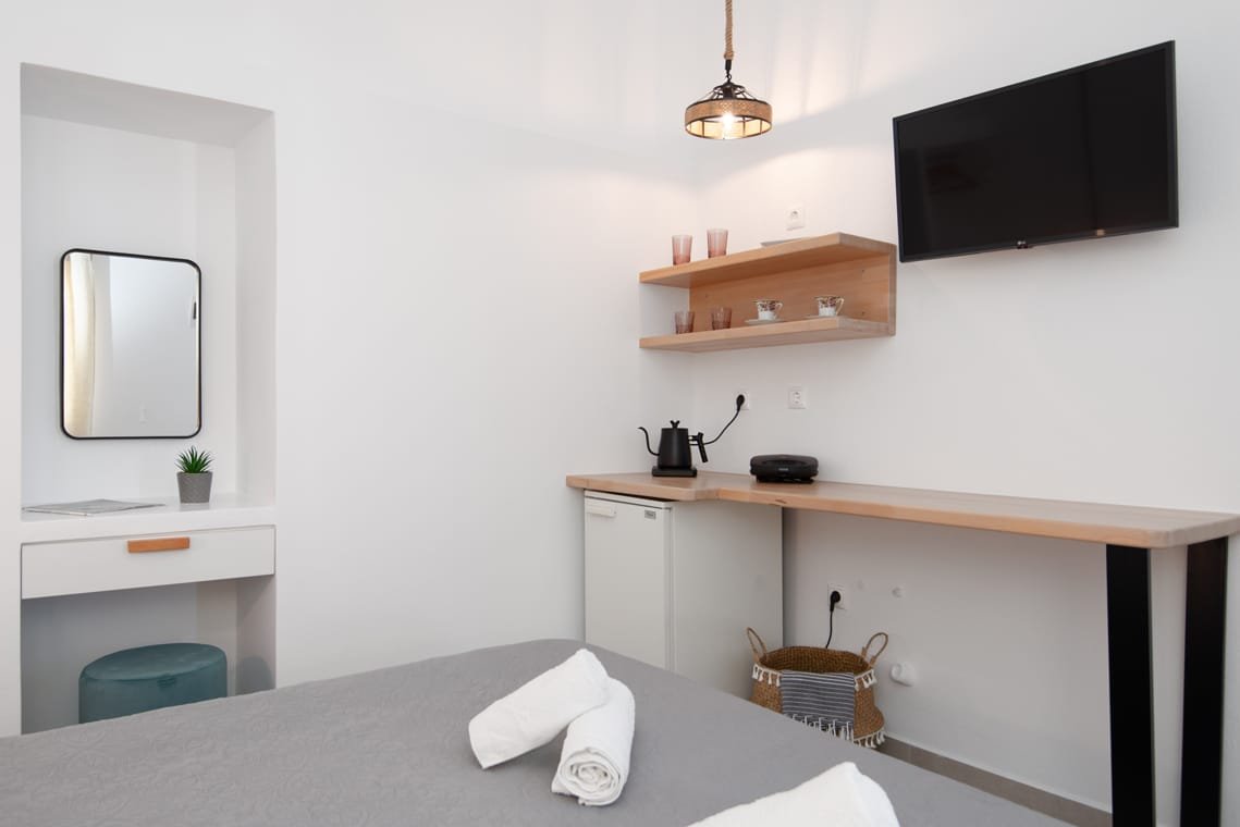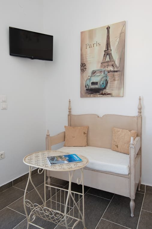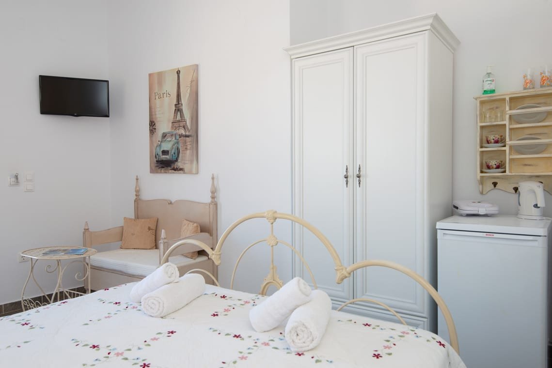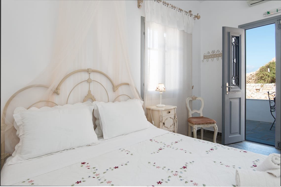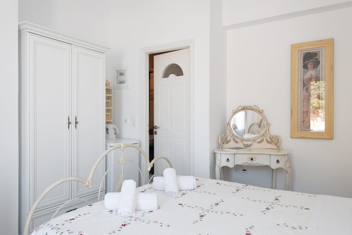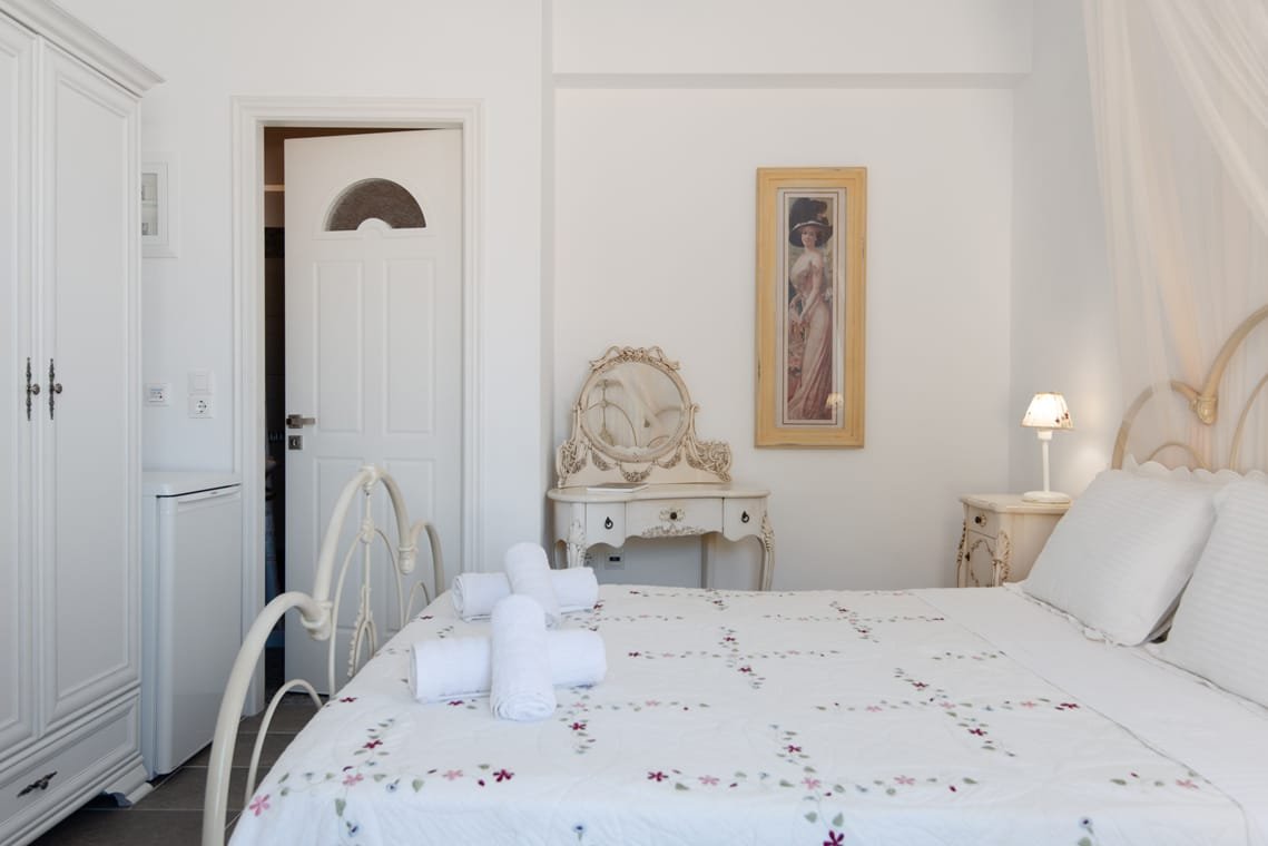 VILLA FRAZESKA has 4 double rooms of 20 m2 about each. They can comfortably accommodate 2 people and are equipped with all the modern amenities. Each room has its own identity. It is uniquely furnished, decorated and painted in distinctive shades. They have a double iron bed with a mosquito net (some of them) and all furnishings are in a romantic – retro style. They have a private balcony or terrace with a view to the sea.