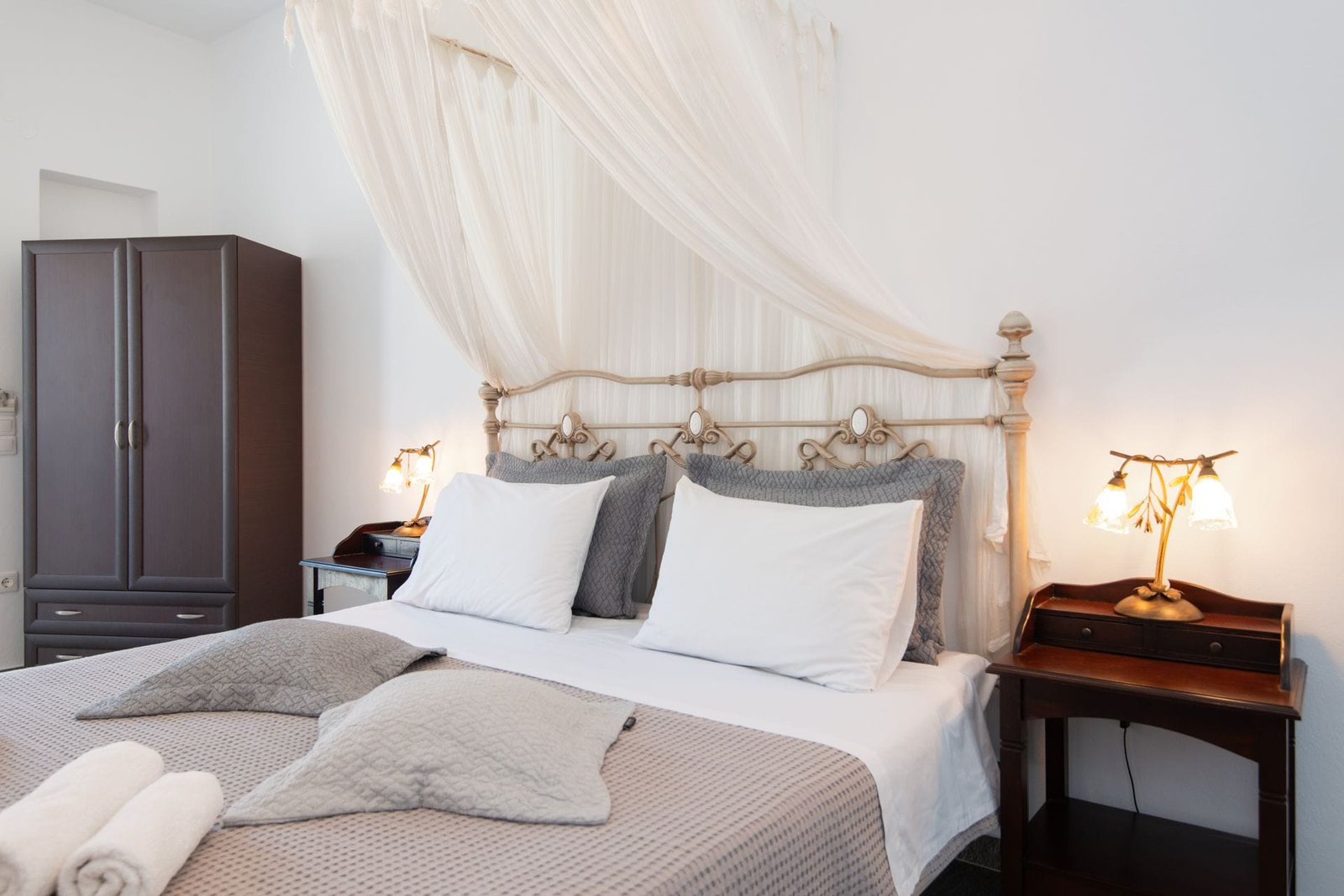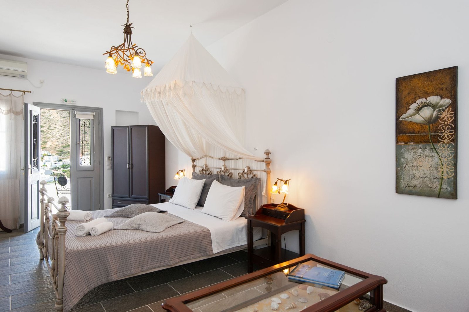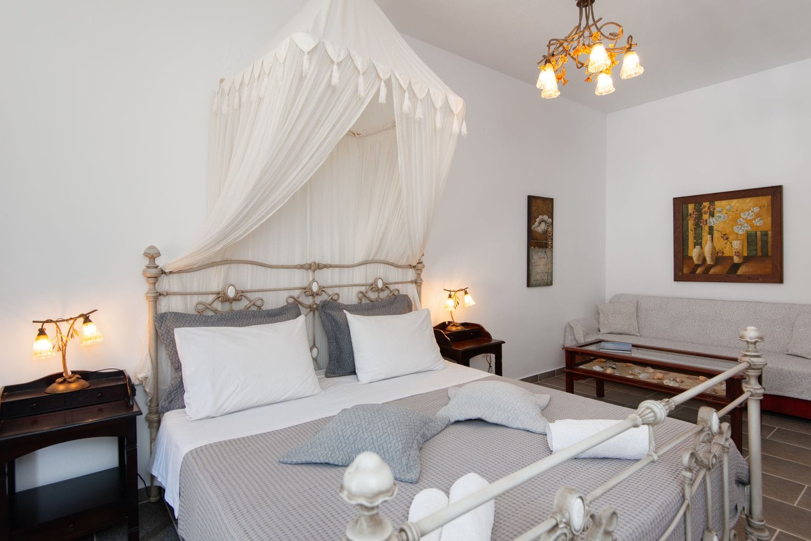 VILLA FRAZESKA has 3 triple rooms of 22 m2 about each. They can comfortably accommodate 3 people, either family or friends. Each room is uniquely furnished, decorated and painted in distinctive shades. They have a double iron bed with a mosquito net (some of them) and a sofa bed. Their furnishings are in a romantic – retro style. They have a private balcony or terrace with view at the sea.